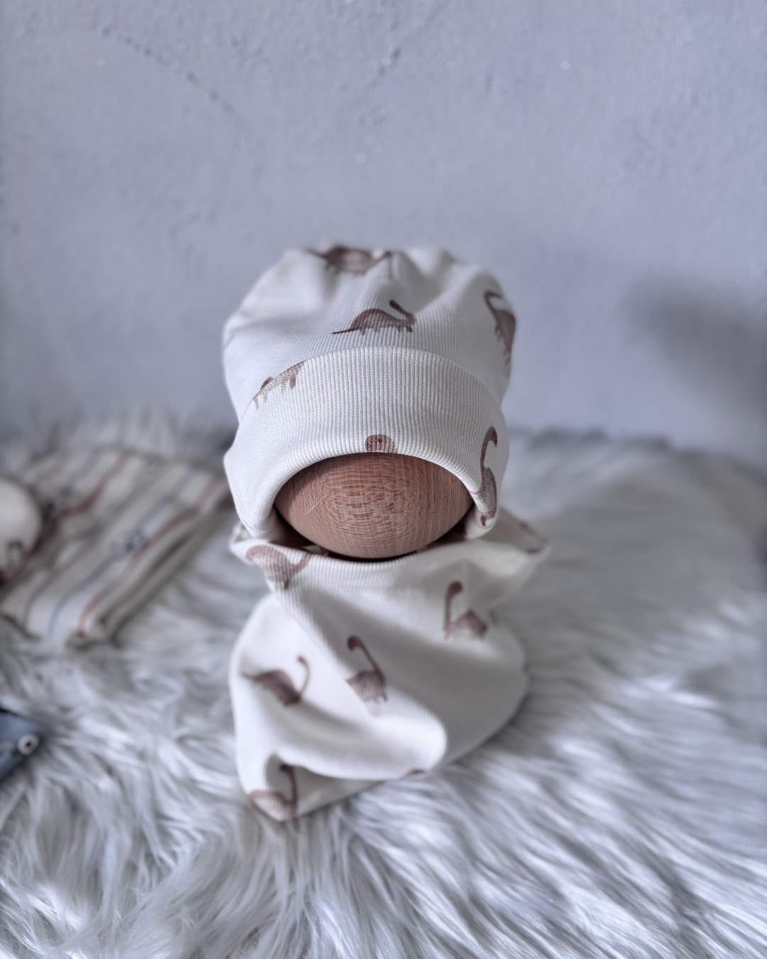 Białe dinozaury Czapka i apaszka lub komin z bawełny prążkowanej – idealna na każdą okazję!